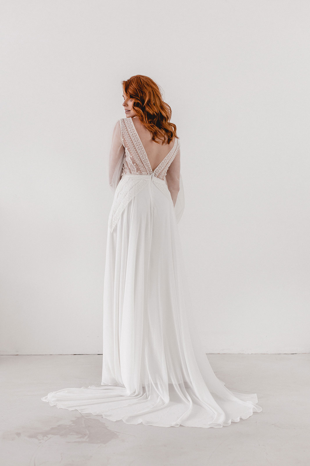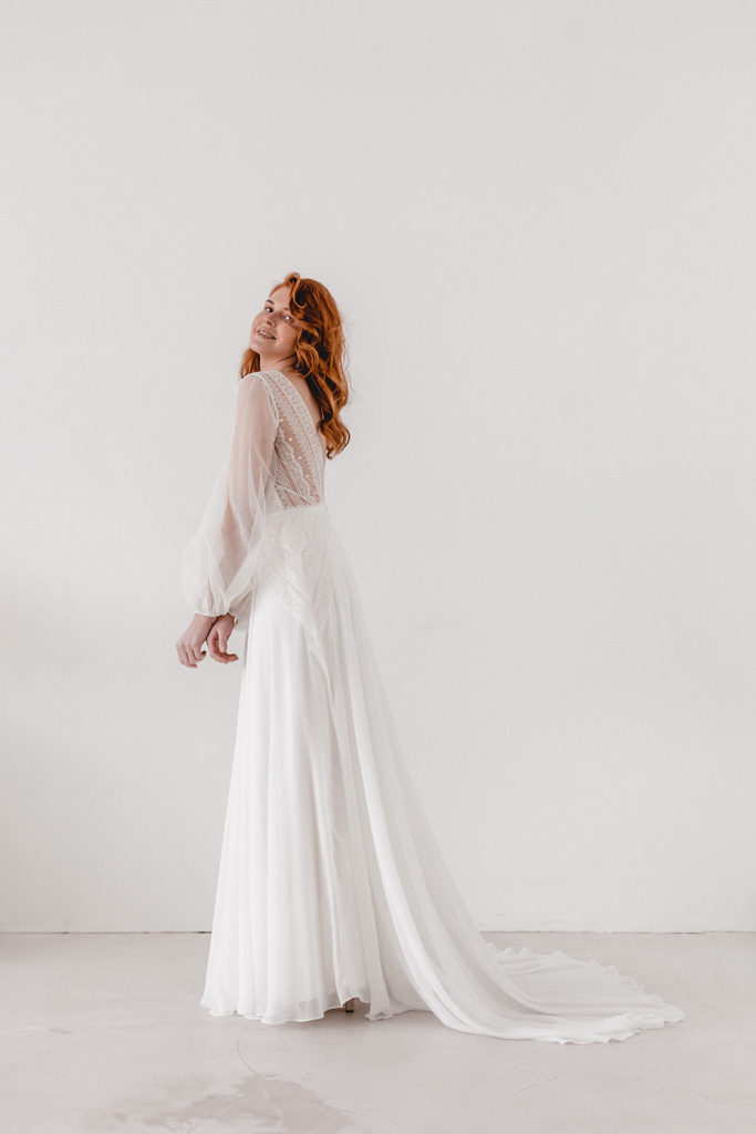 Elaine ist unsere Version einer romantischen Boho-Braut. Geometrische Spitze auf dem Oberteil und verlängert an den Seiten des Rocks gibt einen modernen Touch. Der Chiffonrock besitzt eine Schleppe und das Oberteil hat Ballonärmel aus Feintüll.