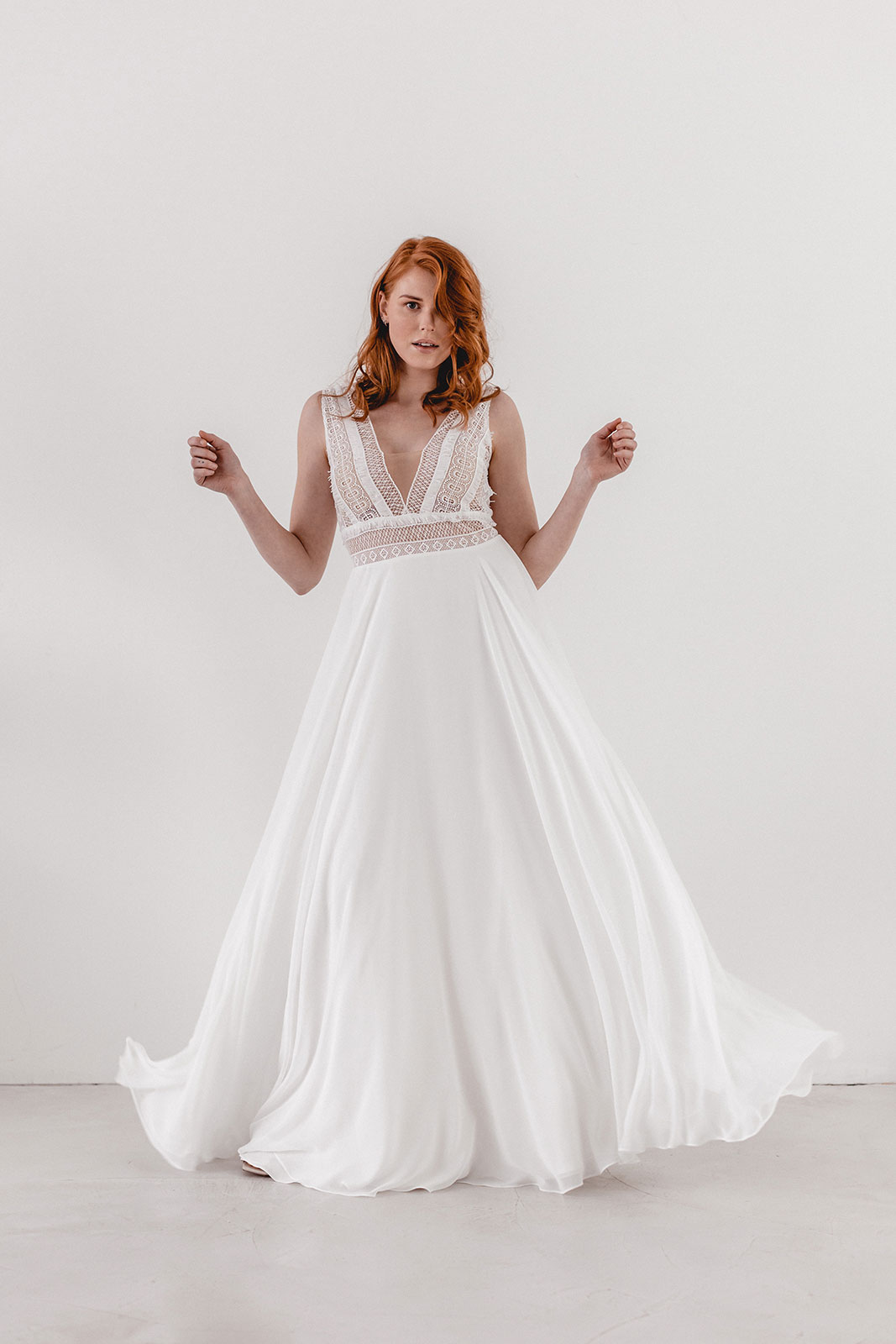 Elif ist das moderne Brautkleid aus Chiffon und einer geometrischen Fransenspitze, die einen wunderschönen, leichten Boho-Touch mit sich bringt. Der leicht ausgestellte Chiffon-Rock schwingt bei jedem Schritt sanft mit.