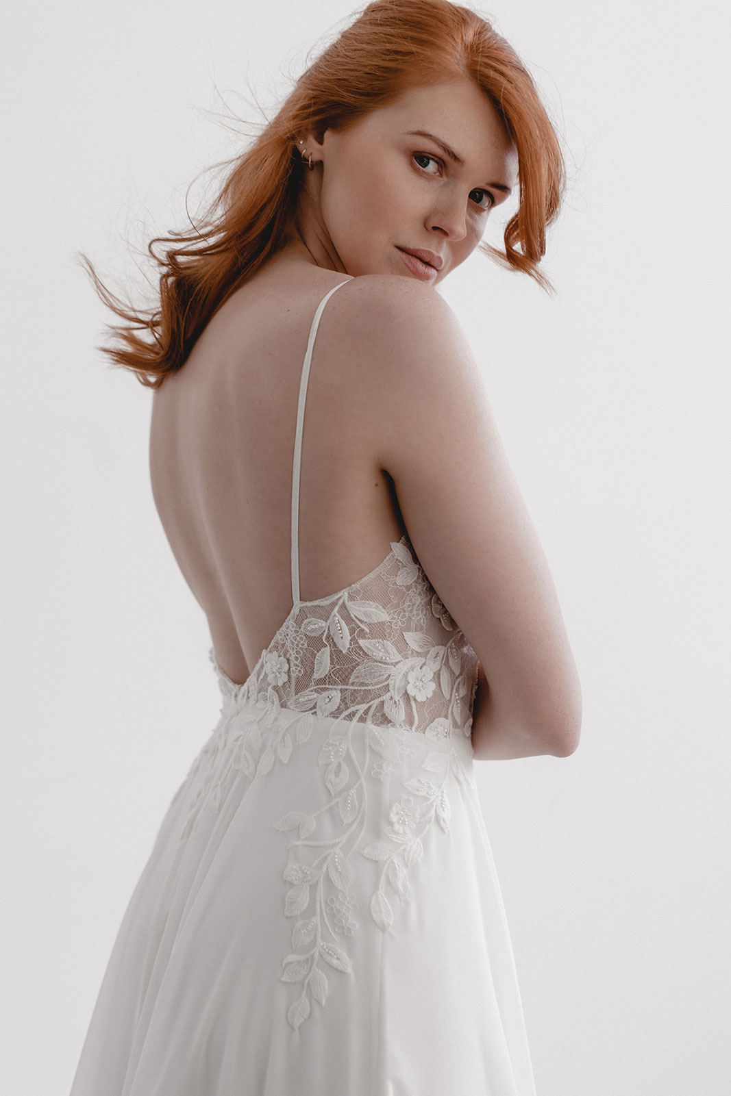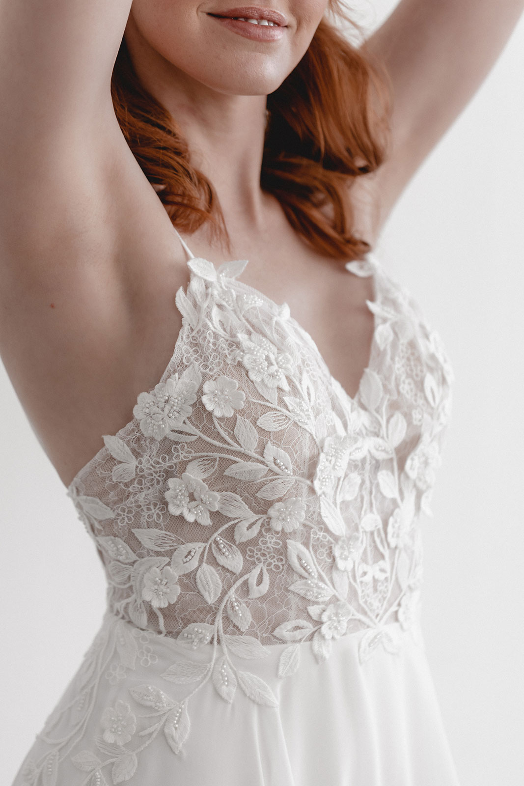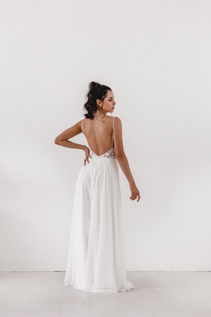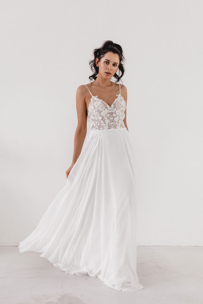 Elisa erinnert an die moderne aber romantische Braut aus der Stadt. Aus Chiffon und mit floraler Rankenspitze, die an der Seite in den Rock übergeht. Auf der Spitze befinden sich kleine Perlen, die leicht in der Sonne schimmern.