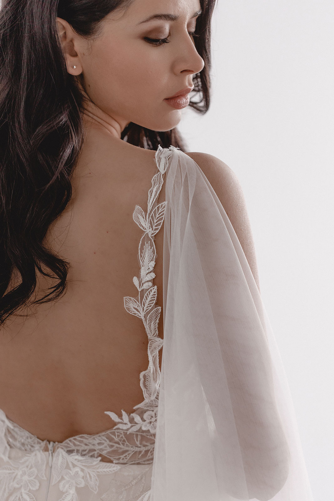 Elliot ist das Brautkleid für die extrovertierte Boho-Braut. Aus ivory- und nudefarbenem Feintüll ist es allein schon farblich ein Hingucker. Das Oberteil besteht aus floraler Blätterspitze, in die Silberfäden eingearbeitet wurden und ist damit eine schöne Abgrenzung zum Rock aus Feintüll.