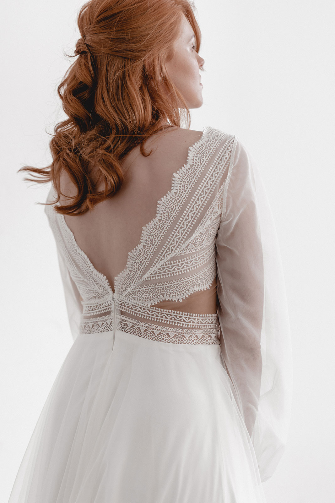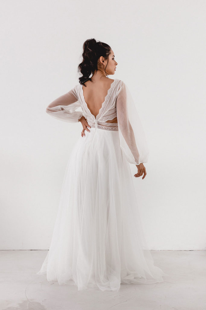 Emily ist eine moderne romantische Version eines Brautkleids. Mit geometrischer Spitze und einem ausgestellten Rock aus Feintüll. Die sanften Ballonärmel sind eine schöne Kombination zu den Cut-Outs an der Seite und runden den Look ab.