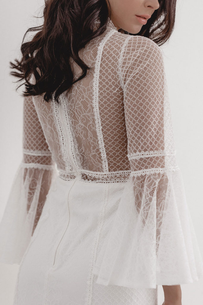Evelin ist eine moderne Kombination aus geometrischer und floraler Spitze, hochgeschlossen mit einem kleinen Stehkragen. Das Brautkleid ist im Fit&Flare Stil gehalten und besitzt kleine Trompetenärmel. Am Rücken wird es mit einem Reißverschluss verschlossen.